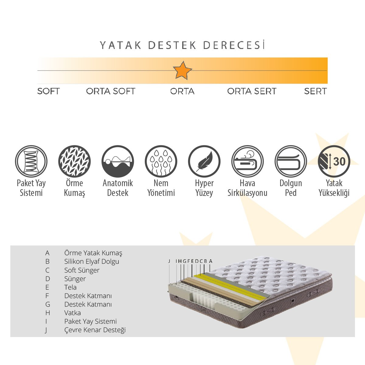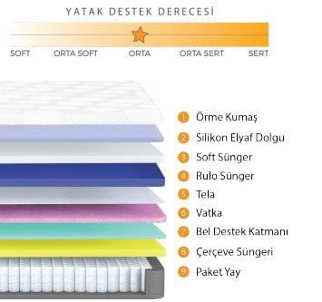 - Paket Yay Sistemi: Bu sistem, vücudun doğal şekline uyum sağlayarak destek sunar ve uyku sırasında rahat bir deneyim yaşamanızı sağlar.