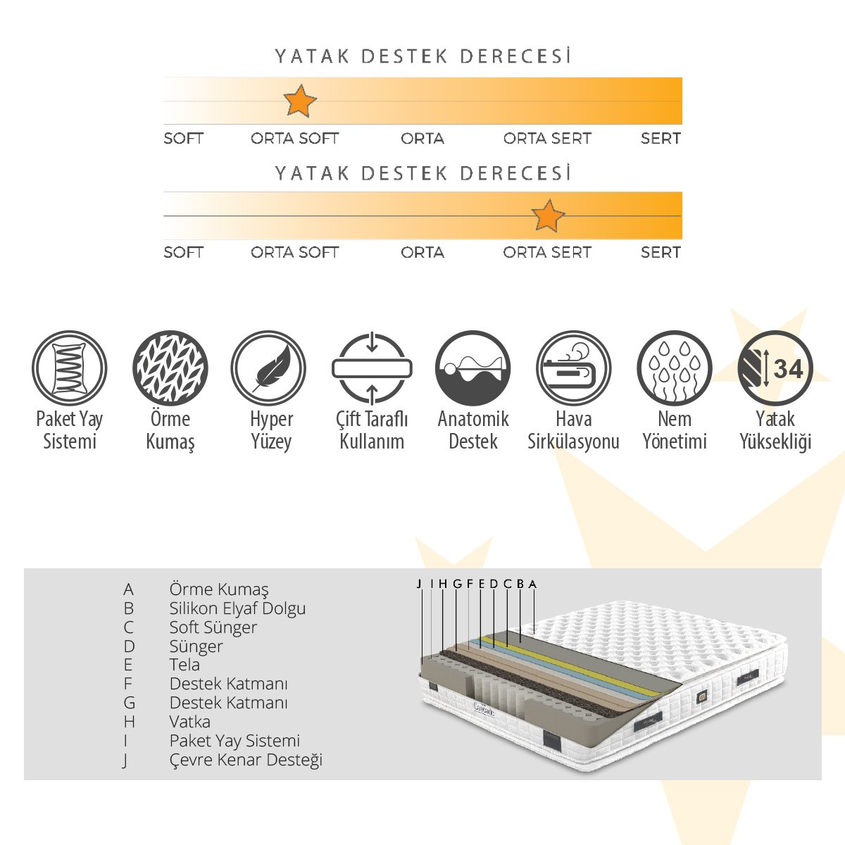 - Vücut Ergonomisi: Yatak, vücut ergonomisine uygun şekilde tasarlanmıştır ve uyurken doğru destek sağlar. Orta derecede yatak desteği sunarak, her uyku pozisyonuna uyum sağlar.